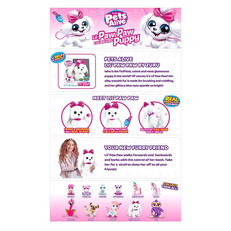 SMOOTHEST FUR: Lil' Paw Paw’s Maltese silky smooth fur is perfect for brushing and cuddling! GORGEOUS DETAILS: The Lil' Paw Paw like her glittery blue eyes, which sparkle. almost as much as her perfectly pink bow and collar. REALISTIC MOVEMENT: Lil' Paw Paw walks forwards and to show her off to all your friends and watch her bark just like a real puppy!
