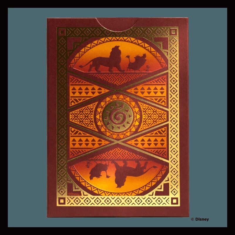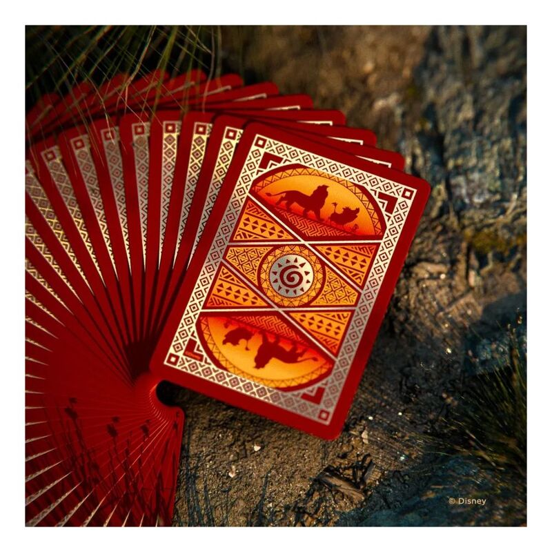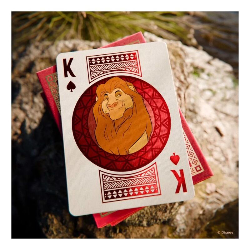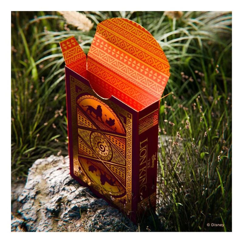 Become the king of game night with Disney Lion King Inspired Playing Cards by Bicycle! Shimmering cold-foil ignites the tuck, card faces and card backs to shine like the savannah sunset, while the legendary lions of Pride Rock grace the court cards with their real elegance. You'll have no worries with the Hakuna Matata ace of Spades in your hand!