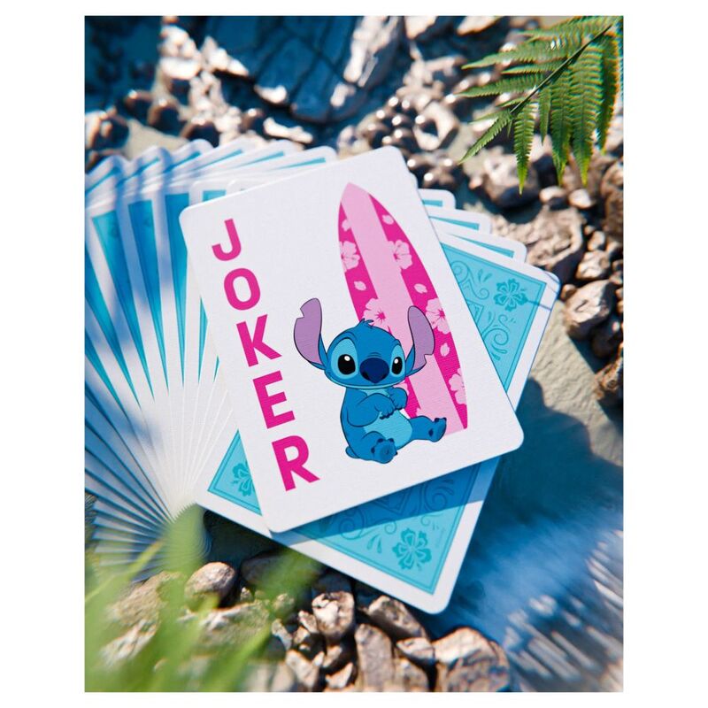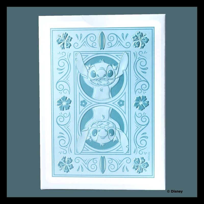 Artwork of Stitch tears through the tuckbox and into our hearts with Disney Stitch Inspired Playing Cards by Bicycle. Bring the Hawaiian magic of Ohana home to your family! Experiment 626 is causing mischief throughout the 54 cards, along with his "boojiboo" Angel on the court cards!
