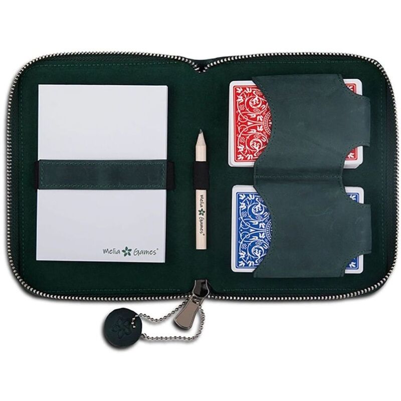 The handmade zip case has been crafted in sustainably-certified genuine full-grain leather. The zip case houses 2 decks of playing cards, perfect for rummy, canasta, bridge and more, a notepad and pencil for score keeping.