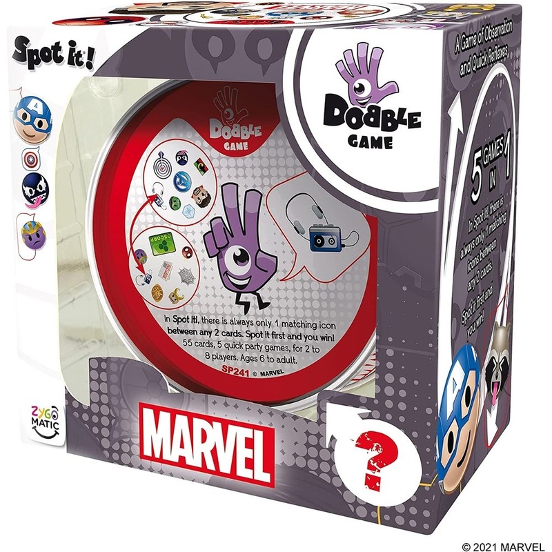 This new version of Spot It! combines different characters from Marvel comics with one of the most emblematic family games. Players try to spot the single matching symbol between two cards in a playful battle of speedy observation. Featuring some of the most iconic Marvel Super Heroes: Iron Man, Captain America, Black Widow!