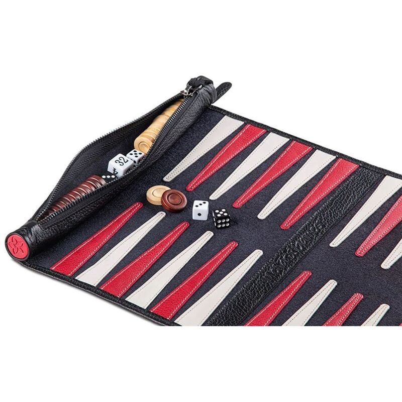 Beautifully crafted from genuine nubuck leather to the highest quality standards, the board unrolls to reveal contrasting top-stitched leather playing points. A handy zipped storage section keeps your counters and dice secure while on the move.