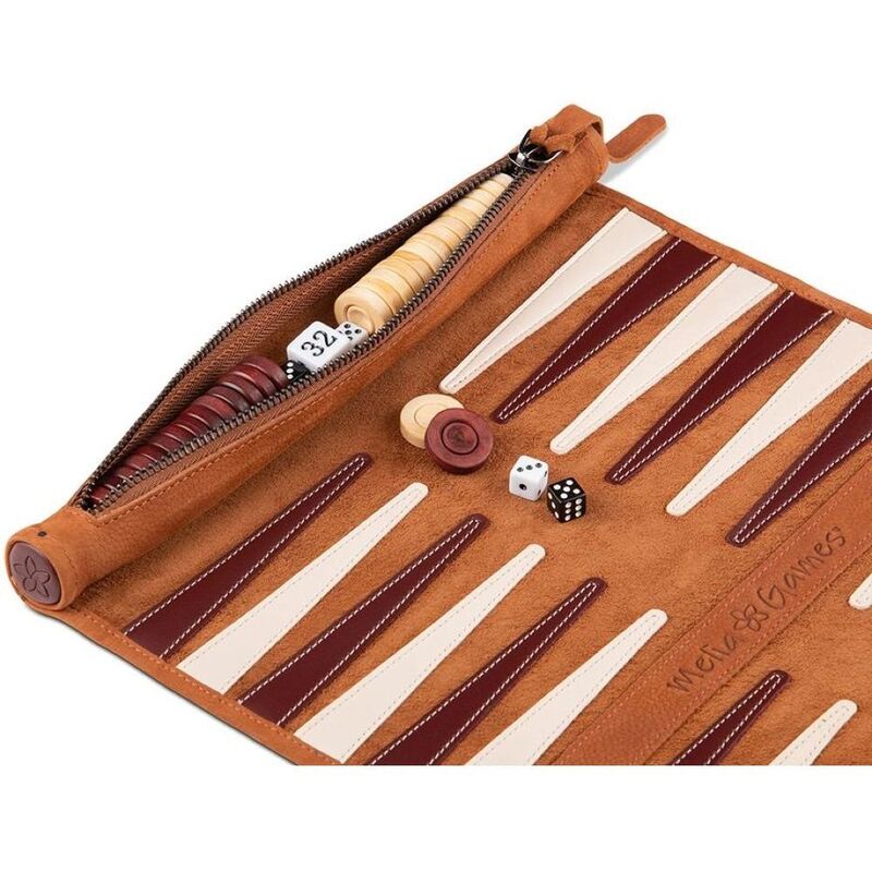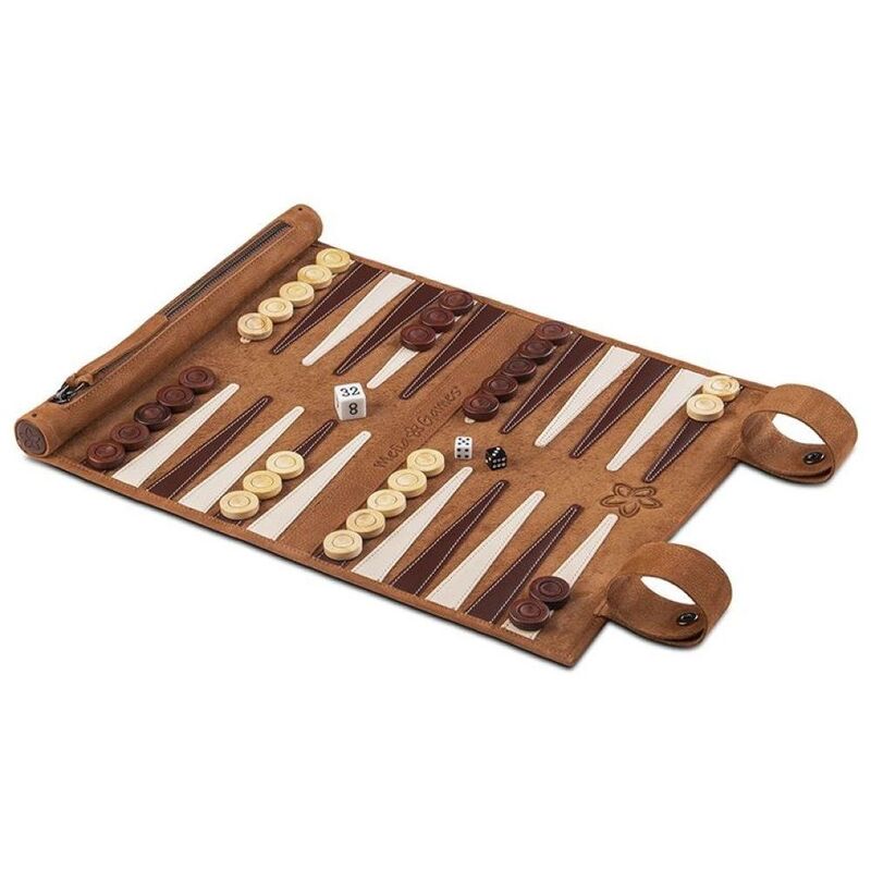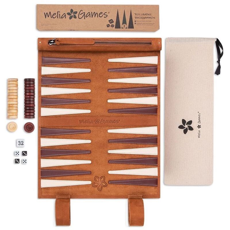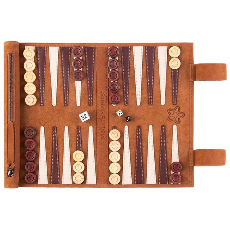 Melia Games Backgammon Travel Roll Up Leather Set - Classic Brown