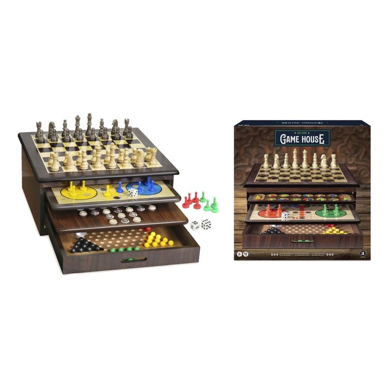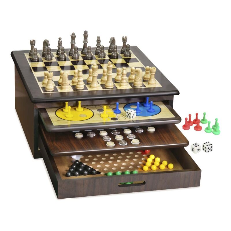 Premium Craftsman Collection.1 Games in 1 tray easily slide out to switch between games. Convenient storage for all accessories. Large Playing Pieces.