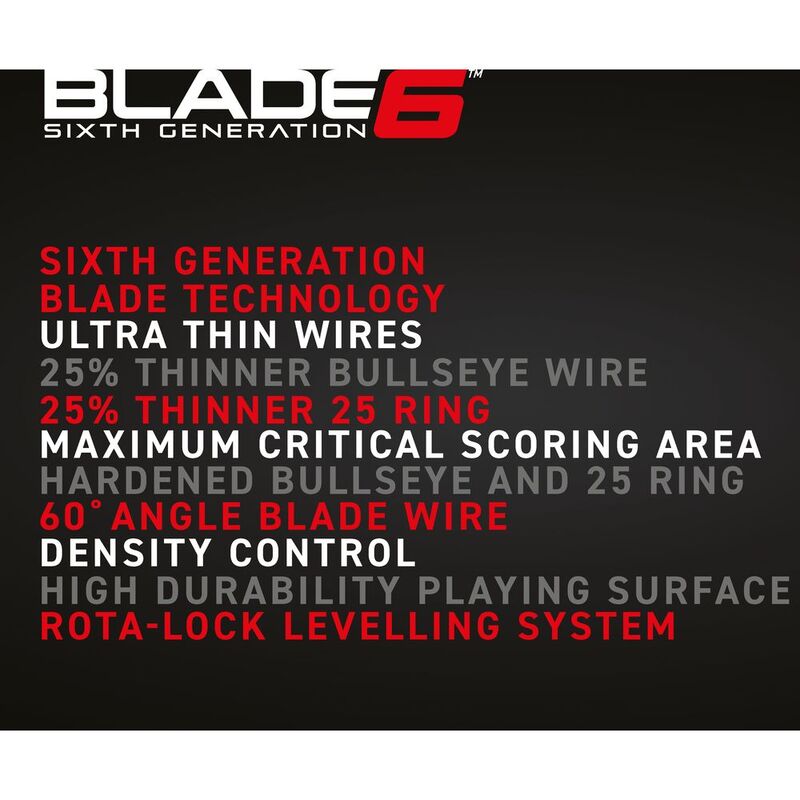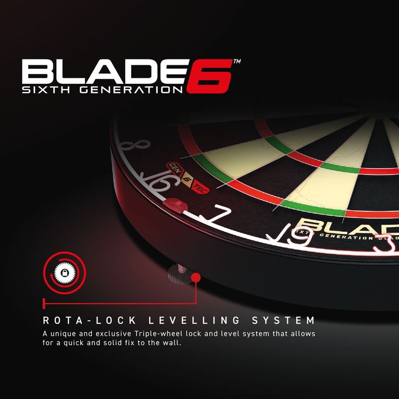 Blade’s pioneering web design features the latest ‘Density Control™’ wire for optimum fibre density and improved dart retention in the double, treble and bullseye zones, for maximum scoring power. The ultra-thin 60° angled wire deflects darts into the scoring area for absolute minimal bounce outs. The fully hardened bullseye and outer bull, both featuring 'Density Control wire', are now 25% thinner. Fitted with the easy adjust Rota-Lock mounting system, the Blade 6 fits any wall allowing you to start playing within minutes.