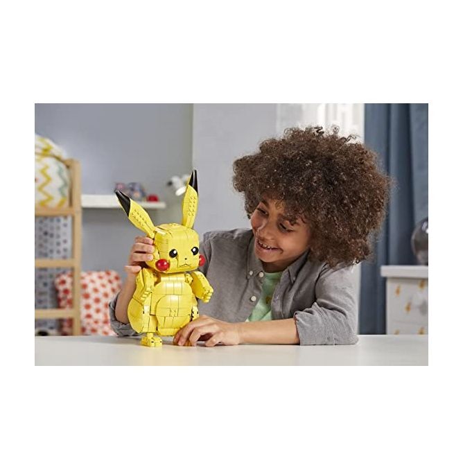 Prepare for a shockingly big battle with a buildable 12-inch Pikachu! Take your Pokémon training to new heights when you use over 600 pieces to build a 12-inch Pikachu! Featuring the beloved Pokémon's iconic lightning bolt-shaped tail, red cheeks and smiling face, this nearly life-size Pikachu is articulated so you can position it in different poses! Ideal for ages 8 and up