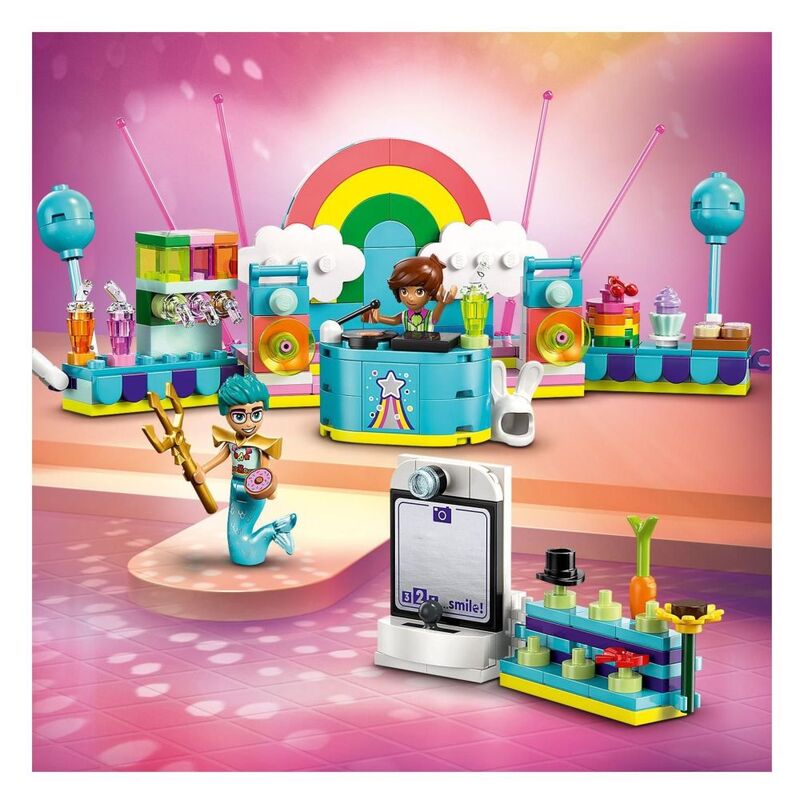 - • Costume-party accessories – This LEGO® toy comes with lots of accessories tspark role play, including a slushie machine, cakes, drinks, balloons, hats, a merman’s trident, a fairy wand and more