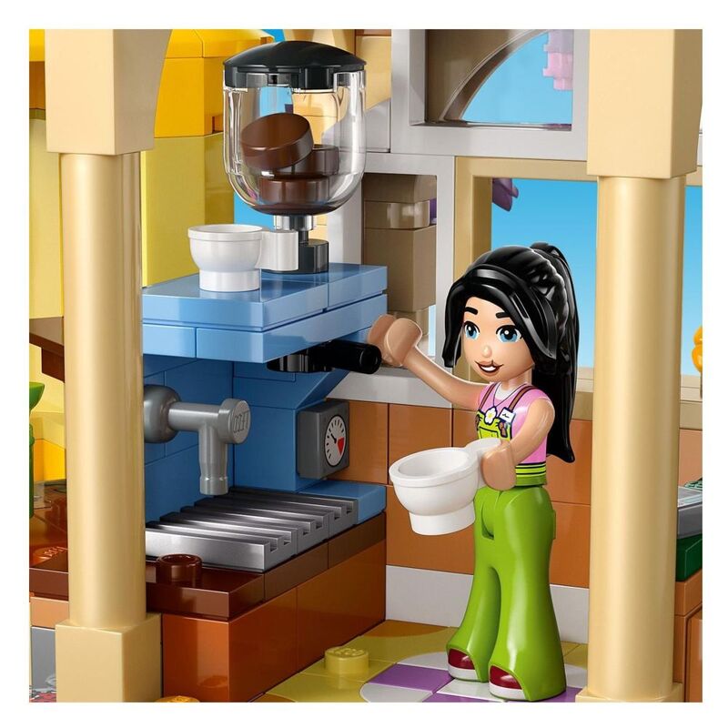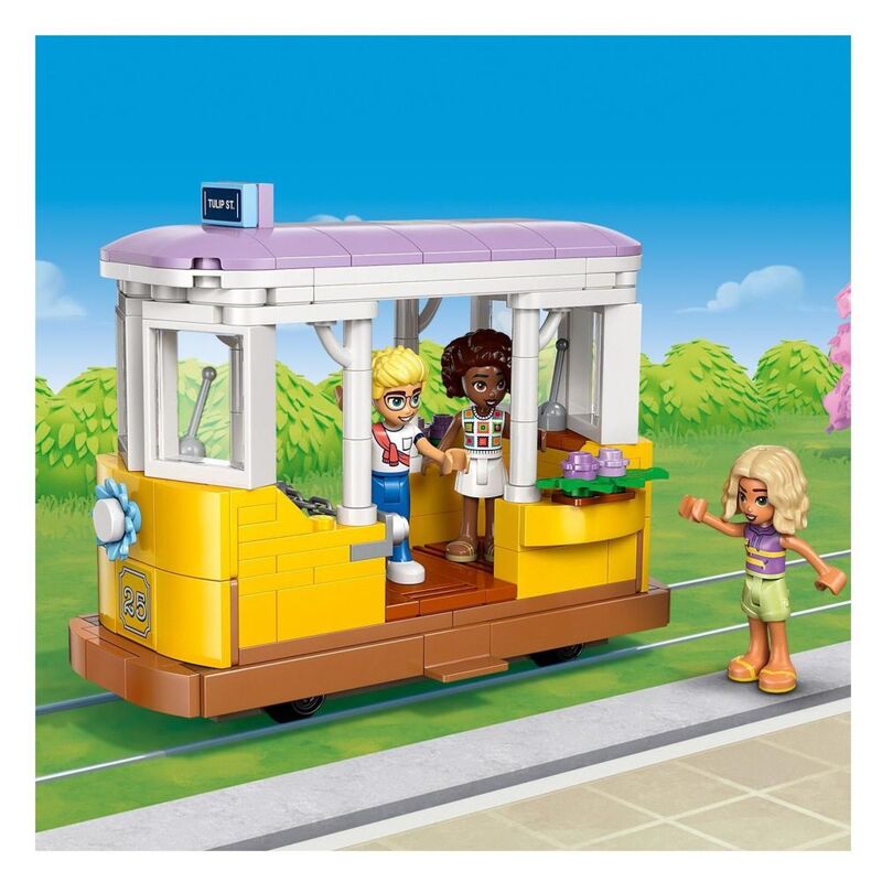 - • Pretend-play set for creative role play – This detailed LEGO® set includes different areas tinspire friendship stories, including a flower shop, café with outdoor seating, a kitchen and a tram
