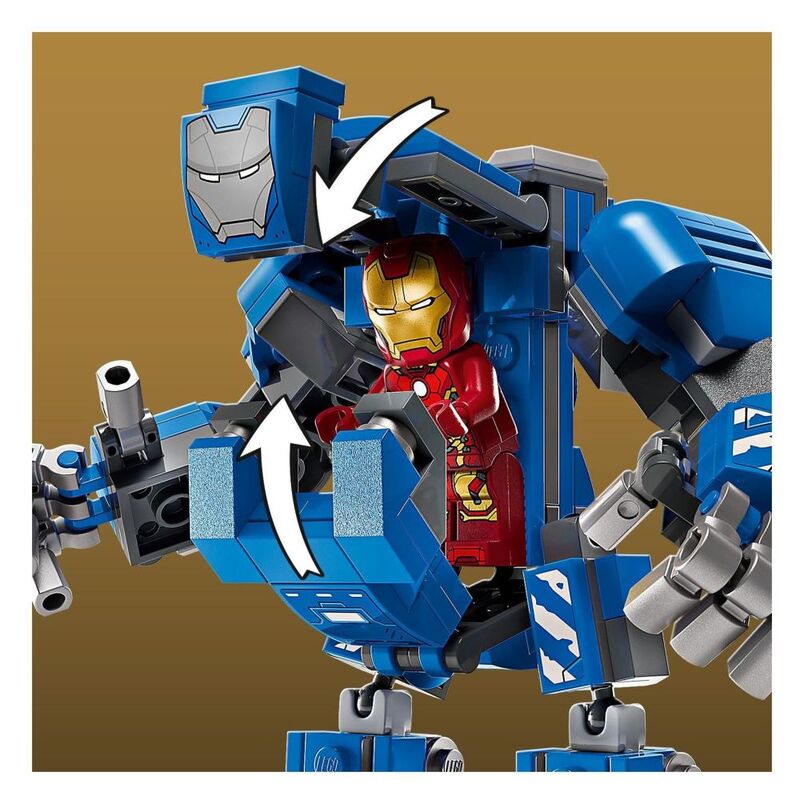 • • Super Hercharacters – MK1, MK43 and MK6 Iron Man armour, Pepper Potts and Aldrich Killian minifigures, a buildable Dum-E robot and an MK3 mech with movable arms and legs and an opening cockpit