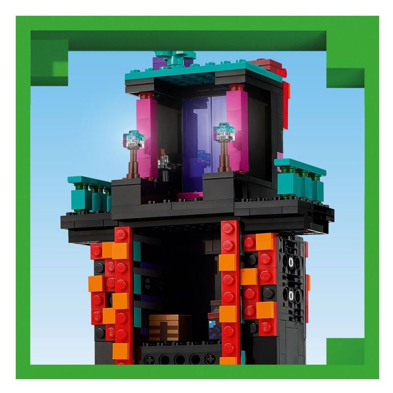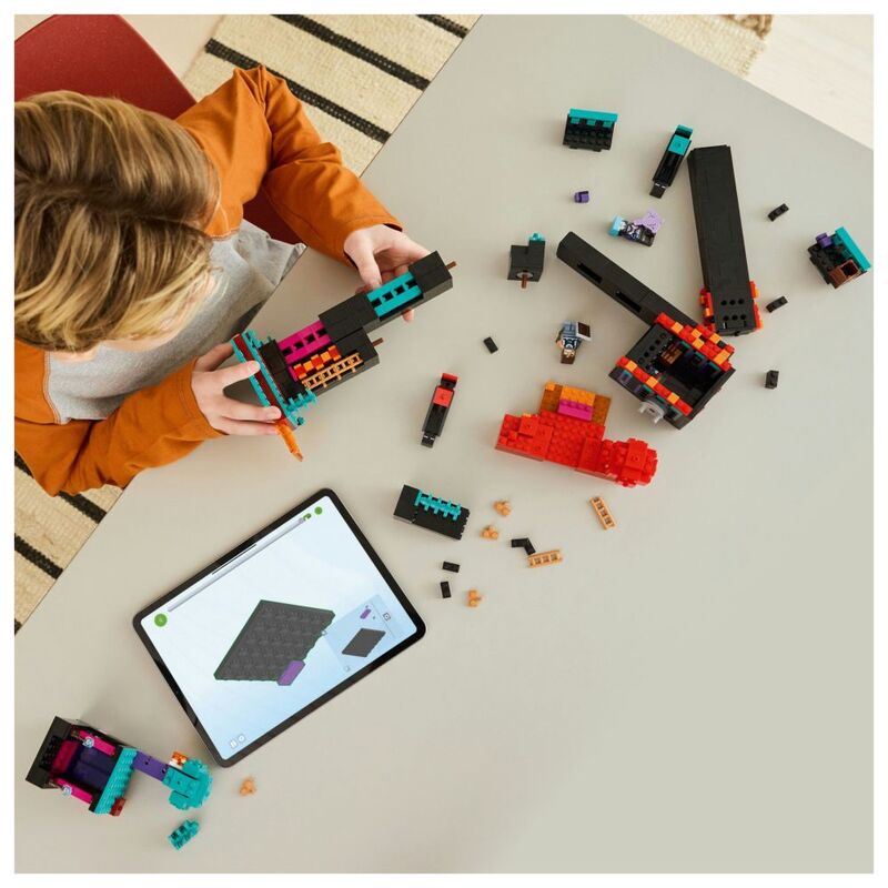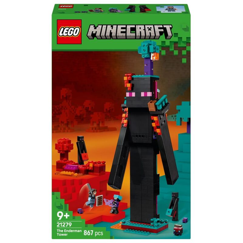 The primary build is an Enderman-shaped tower with a Nether portal in its head, a balcony on each shoulder and 2 rooms containing a crafting table, an enchanting table and a storage box for Ender pearls. Ladders provide access up the legs, the posable arms are fully articulated, and outside are elements of the warped forest and crimson forest biomes. The set features a Dimensional Defender, Realm Raider and 2 Enderman minifigures, plus 2 Endermite mob figures. Weapons include a Minecraft crossbow and netherite sword and shield. The Enderman Tower model can be rebuilt into 2 colour-coded fortresses, which is great for PvP (Player versus Player) action. Build with the LEGO® Builder app. Contains 867 pieces.
