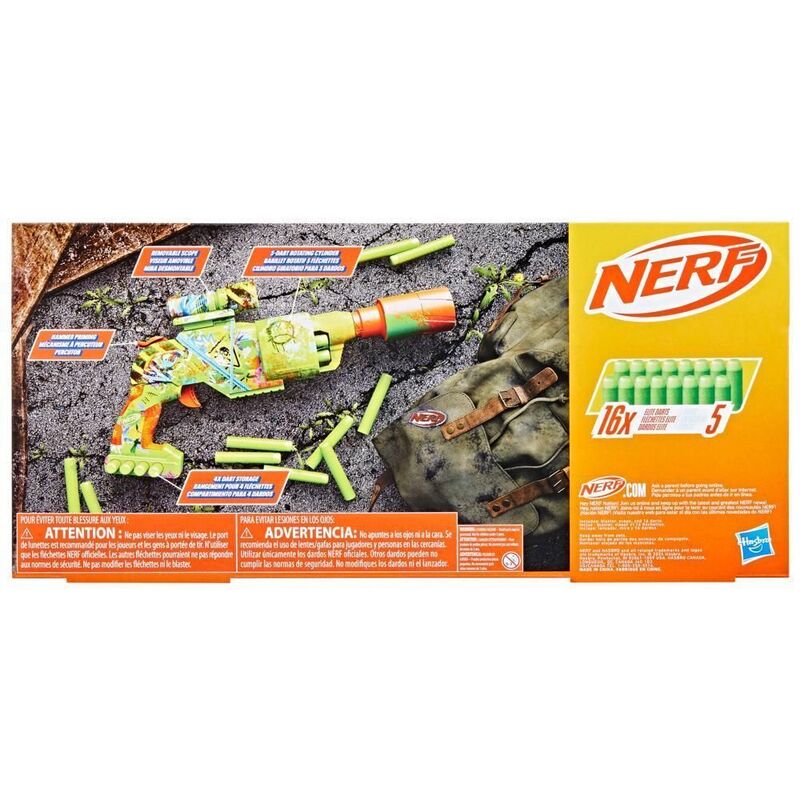 The Nerf Zombie Driller dart blaster is fully decorated with colorful, eye-grabbing, and zombie-inspired graffiti designs on both sides. The blaster's design creates the look of battle gear that zombie fighters would engineer in a world overrun by the ghoulish undead. The Zombie Driller blaster is designed to look like a drill that's been turned into a zombie fighting blaster. It has a rotating cylinder with 5-dart capacity and includes 16 Nerf Elite foam darts and a removable Nerf scope. Featuring fun details from end to end, the Nerf Zombie Driller blaster is great for zombie fans and a perfect accessory for zombie parties, games, and events. Nerf toy blasters are great indoor and outdoor toys for kids ages 8 and up to enjoy fun, active play. Each sold separately, subject to availability. Eyewear recommended (not included). No batteries required. Nerf and all related properties are trademarks of Hasbro.