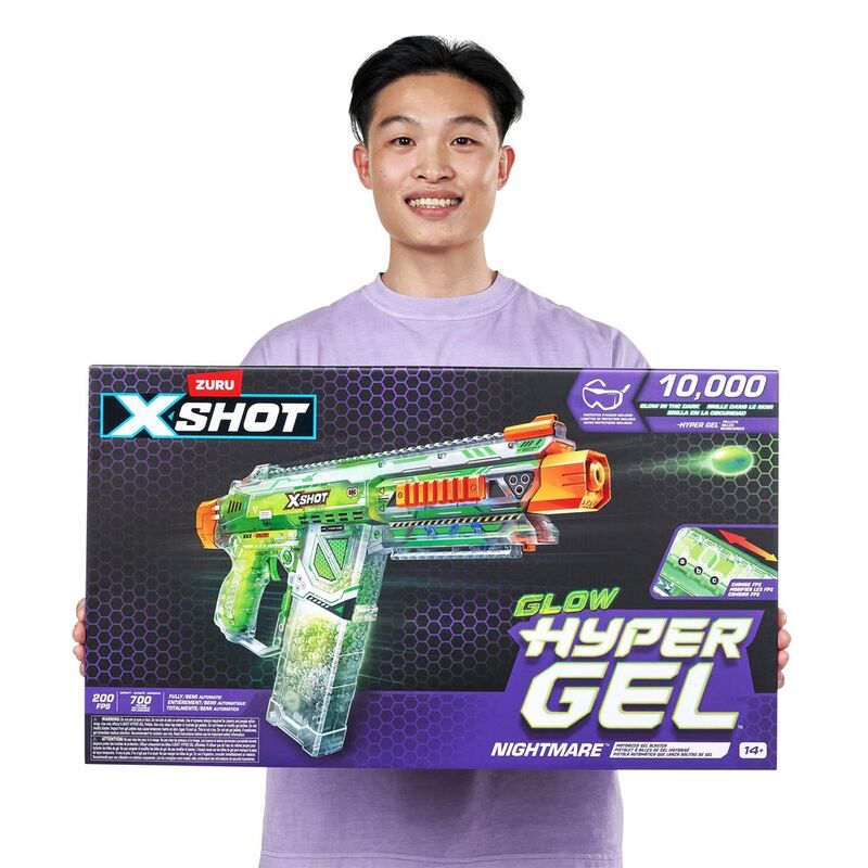 It's time to get hyped up with XSHOT Hyper Gel! The XSHOT Hyper Gel Glow In The Dark Nightmare is the largest blaster in the Glow in the Dark Hyper Gel range and can blast Hyper Gel Pellets at 200 feet per second with its motorized fully and semi automatic modes. Battle all night long with the Nightmare's Glow in the Dark technology, and Glow in the Dark Gel Pellets, which will push your blaster battles to the NEXT LEVEL! XSHOT Hyper Gel Glow In The Dark Nightmare has a 700 Pellet capacity mag. This motorized Gel Blaster comes with a rechargeable battery. Stocked with 10,000 Glow in the Dark Hyper Gel Pellets and protective eyewear, just add water to start the ultimate Gel Blaster battle!