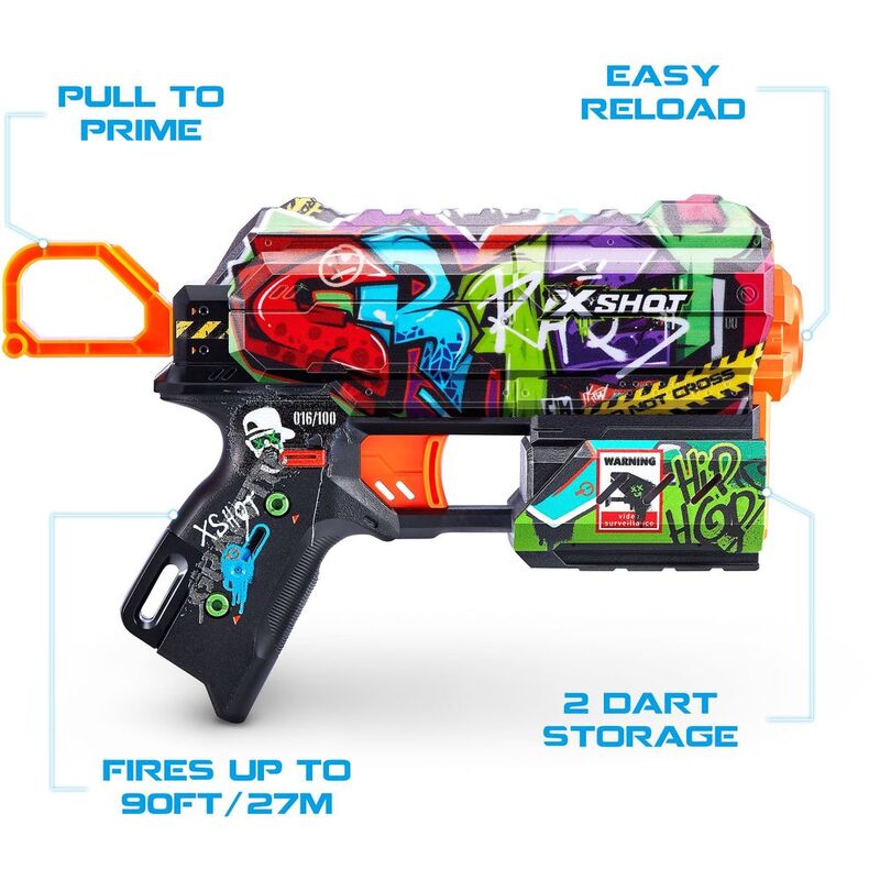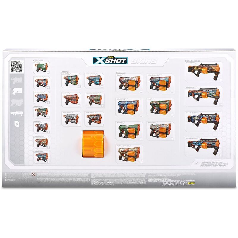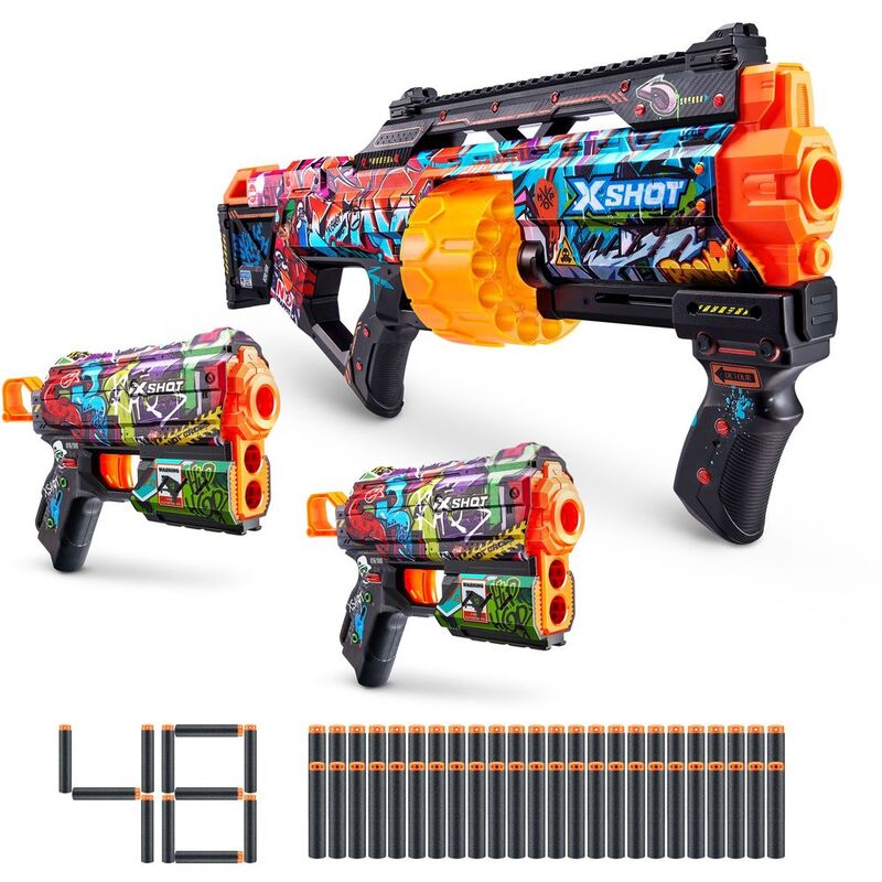 - Pack Inclusions: 1x X-Shot Skins Last Stand Blaster 2x X-Shot Skins Flux Blaster 48x Air Pocket Technology Foam Darts