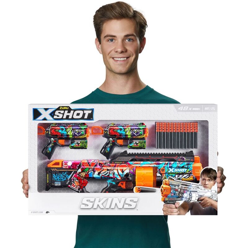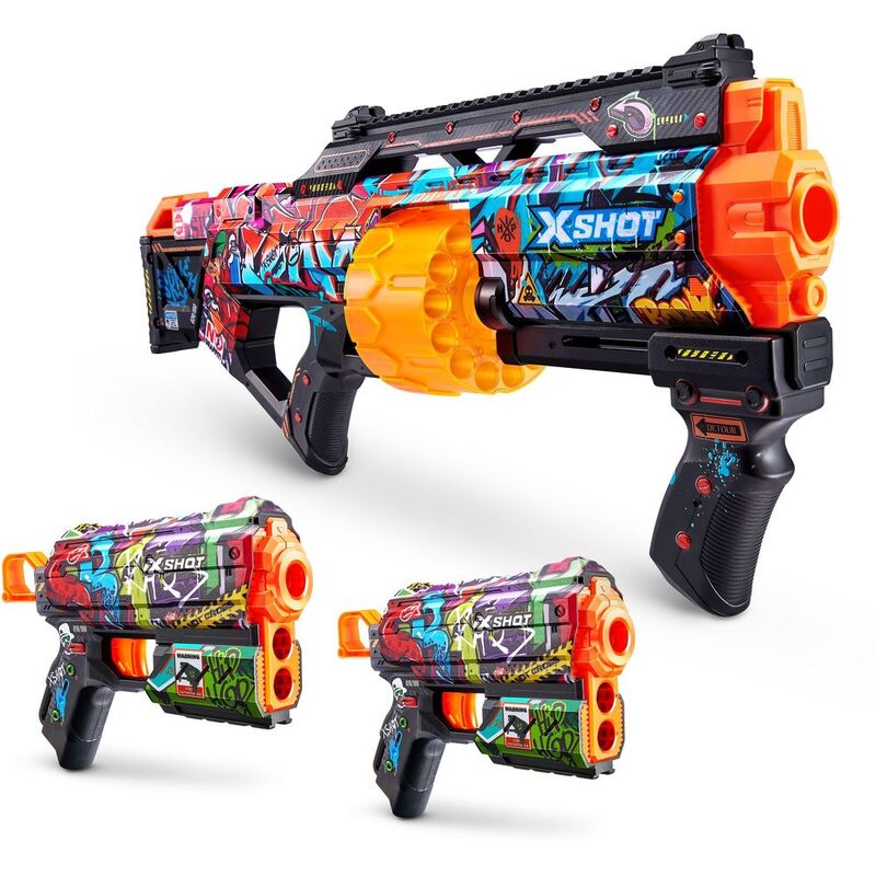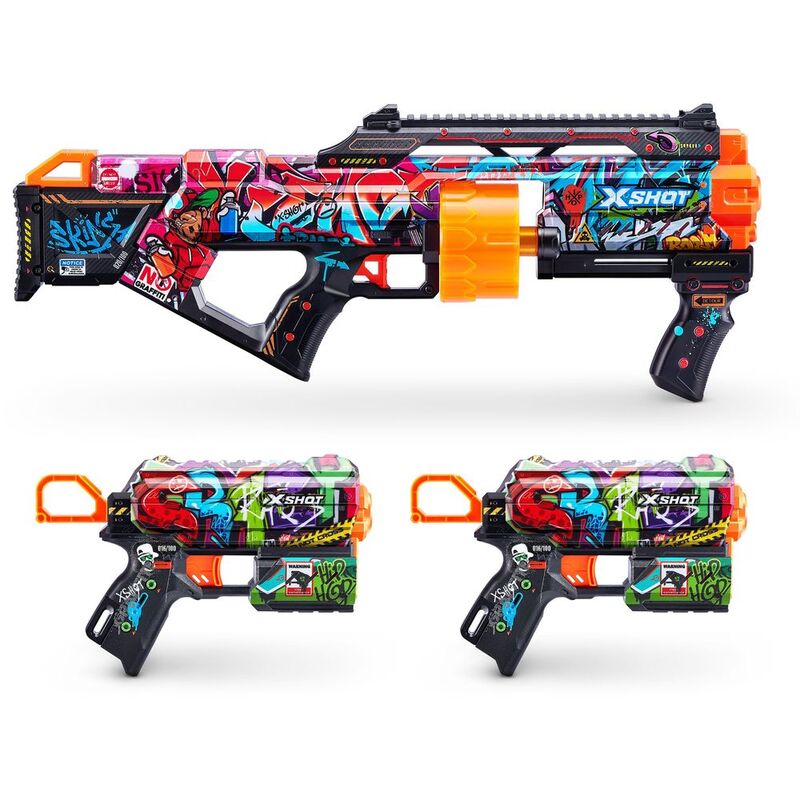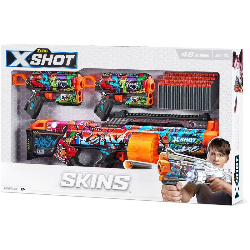 - Steet Battle Pack: Using a new state of the art printing technology, X-Shot Skins is the first custom designed blaster that brings the in-game experience of skinning your blaster to the battlefield. The X-Shot Skins Last Stand Double Flux Combo Pack includes 1x Last Stand and 2x Flux blasters decked out in Graffiti skins, perfect for a tagger or anyone wanting to battle it out street style! Choose different, choose X-Shot Skins.