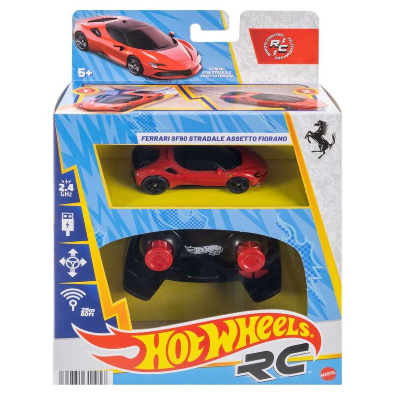 Take remote-control driving to the next level with the Hot Wheels RC 1:64 scale Ferrari SF90 Stradale Assetto Fiorano. Featuring authentic details and iconic styling, this RC can race on and off Hot Wheels tracks and has a booster button to speed through loops and stunts. (Hot Wheels track sold separately.) The full-function remote control has a frequency of 2.4 GHz to prevent interference when challenging other racers. Colors and decorations may vary.