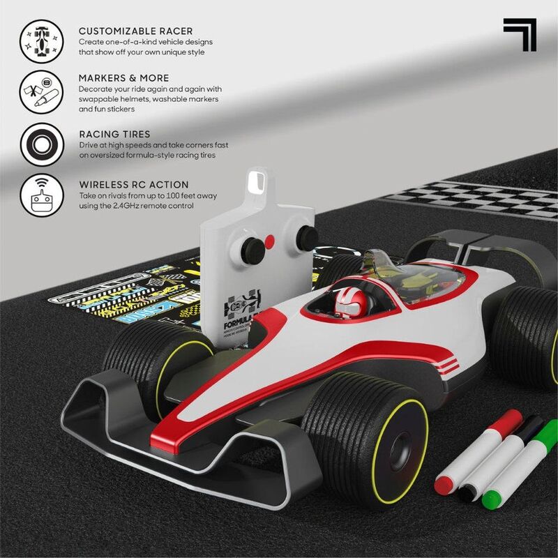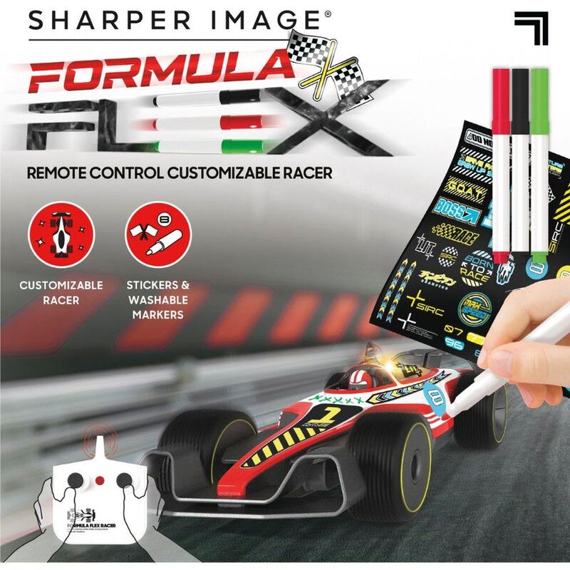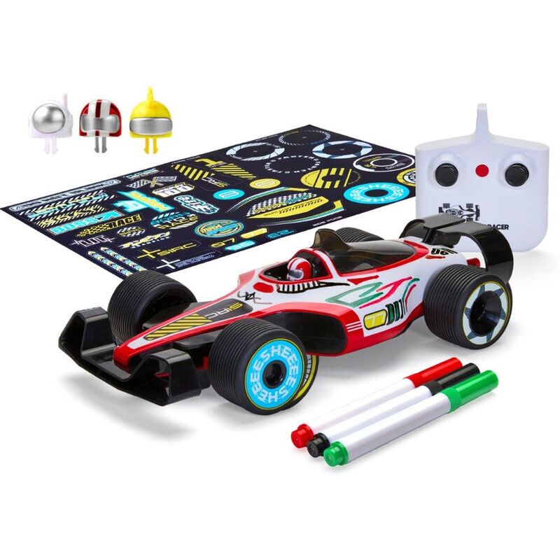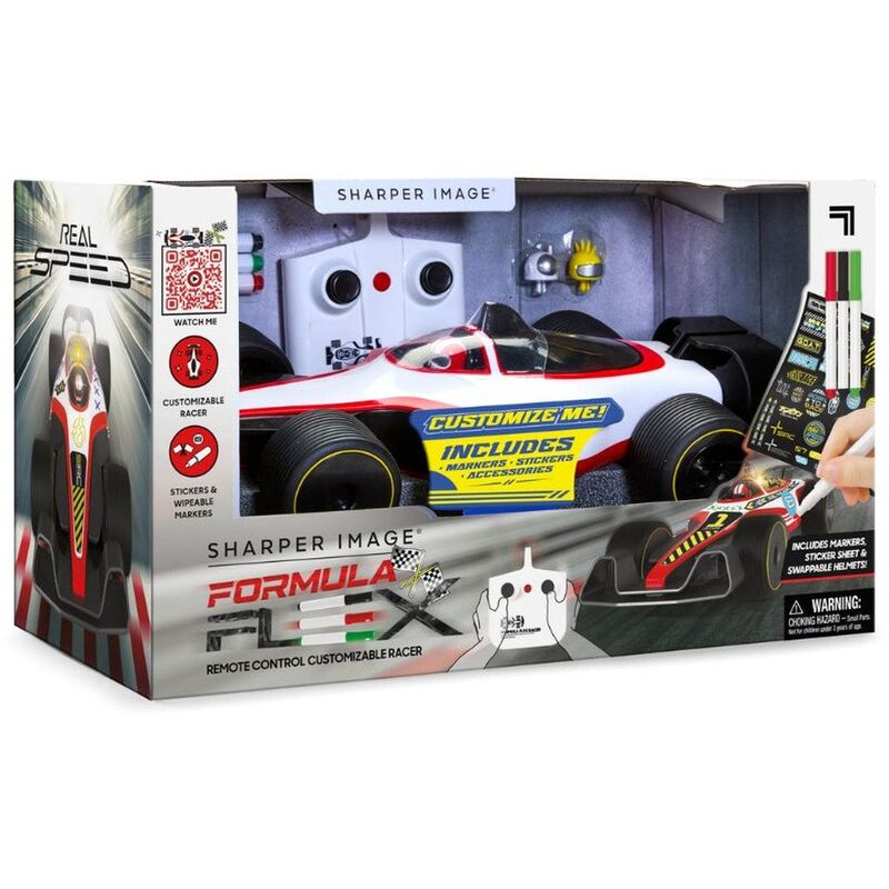 Let kids race in style with the Sharper Image Formula Flex RC Car, a fully customizable remote control racer that puts their creativity in the driver's seat. This interactive racing car lets children design their own look using the included wipeable markers, full-color sticker sheet, and swappable driver helmets. When not in use, the markers store neatly in the rear of the car, doubling as colorful tail pipes for an extra design touch. Once decorated, they can hit the track using the easy-to-use 2.4GHz remote that controls the car from up to 100 feet away. The Formula Flex features oversized tires for quick turns and smooth handling on flat surfaces, while the wipeable body means they can create new designs whenever inspiration strikes. Whether it's fast-paced RC action or creative hands-on play, this set delivers hours of entertainment for kids 6 and older.